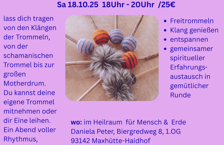 - Vollmondtrommeln in der Natur Örtlichkeit (nähe Regenstauf), monatlich, abends, bei jedem Wetter. Anmeldung bitte bei ersten Besuch! Di 07.10, Mi 05.11, Fr 05.12 ), Verleihtrommeln vorhanden, - Auf Spendenbasis 10 € rote Verleihtrommeltasche-
